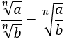 El cociente de raíces (del mismo orden) es la raíz del cociente de sus radicandos.