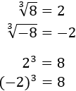 Por ejemplo, la raíz cúbica de 8 es 2 y la de -8 es -2: