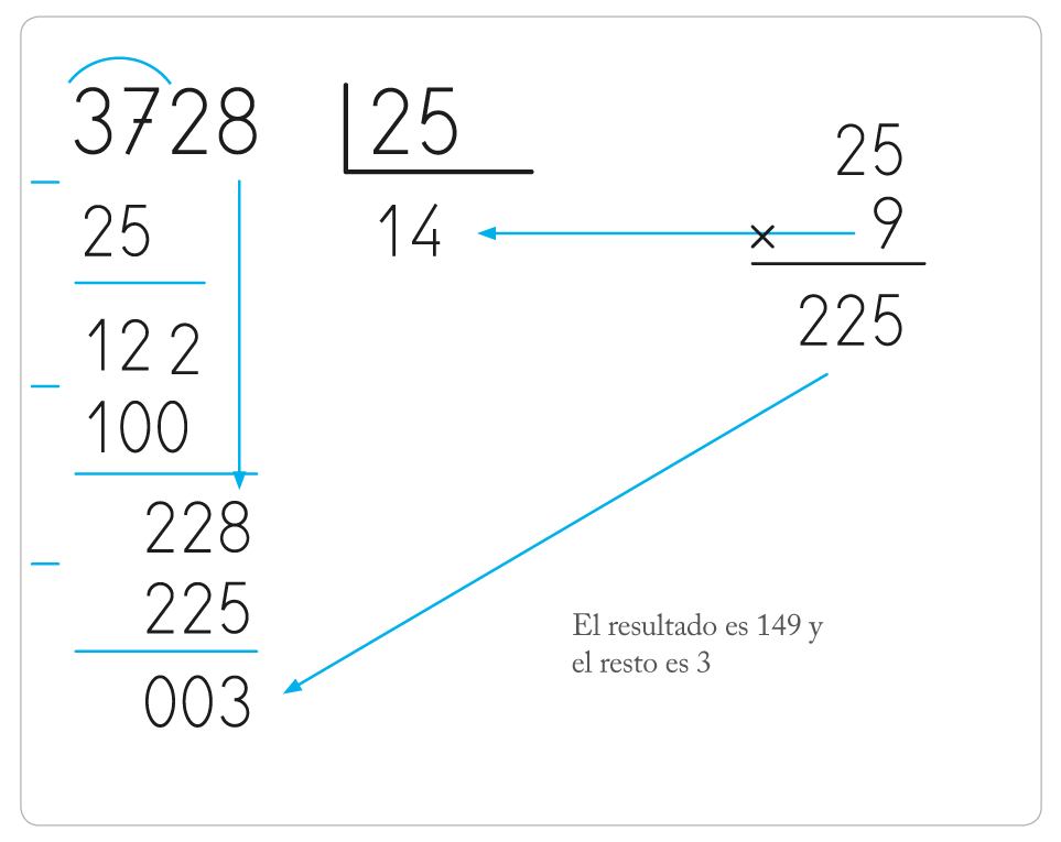 Es un método que se basa en usar la misma técnica que usábamos en las divisiones de una cifra. Puede usarse para comenzar a dividir. Se trata de multiplicar el divisor, con sus dos cifras para saber qué número multiplicado por el divisor se acerca a la cantidad que tenemos en el dividendo. Vamos a ver como se hace con un ejemplo: 3728: 25