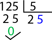 Ya solo nos queda hacer la resta final, 25 menos 25 es igual a 0, que es el resto de nuestra división. También podemos deducir con esto que 125 dividido entre 5 es igual 25.